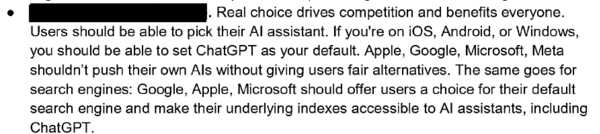 Their strategy for combatting competition is similar to how web browsers work now, the users can pick their default. If they are able to achieve this, they create a user driven democratic process for which AI model is the most popular. And Open AI believes wholeheartedly that they have the best offering.